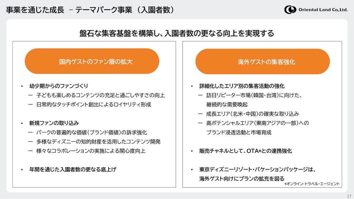 霜田:はい。やはり背景としては2つありまして、1つが今の単価の部分。外国の方はいつでも来られるわけではないので、体験を最大限に楽しみたいという方が「ディズニー・プレミアアクセス」などを購入されますね。お土産なども含め、全体的に平均よりは使っていただいている傾向になります。