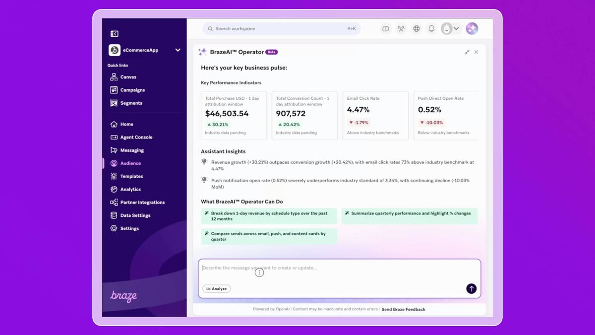 これはマーケターがBrazeと関わる新しい方法でもあります。「BrazeAI Operator」は、マーケターが触れる最初のエージェント型機能です。マーケターの仕事を加速させる単一のインターフェースで、キャンペーン構築やデータ分析、自動化、質問対応までを、会話形式のシンプルなプロンプトで行えます。