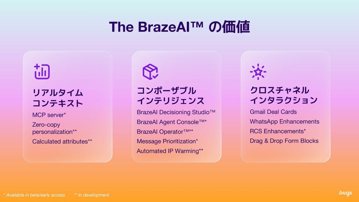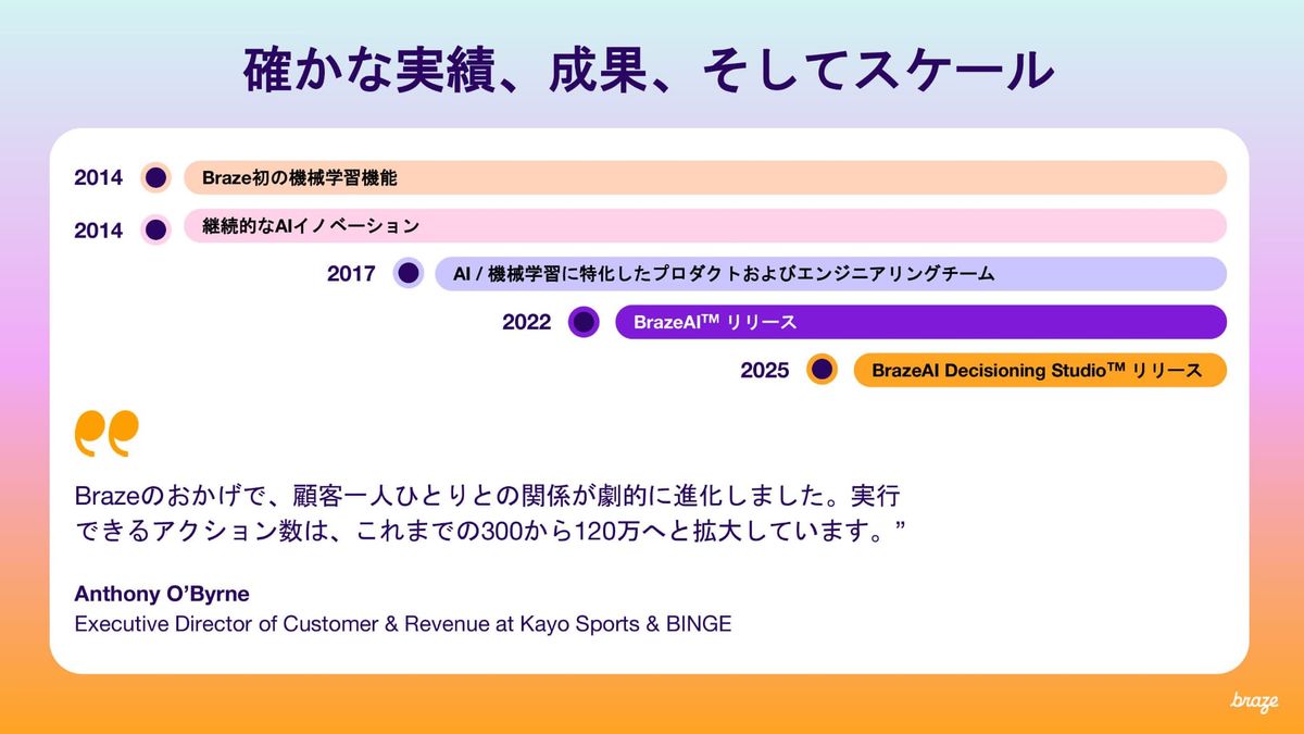 AIは、Brazeの物語の中で10年以上前から重要な要素でした。私たちは2014年に初の機械学習機能を作り、その後AIはプラットフォームに織り込まれた存在となりました。専任のAI、MLチームを発展させ、2022年にBrazeAI製品群として正式に発表し、2025年にはBrazeAI Decisioning Studioを導入してパーソナライゼーションをさらに進化させました。