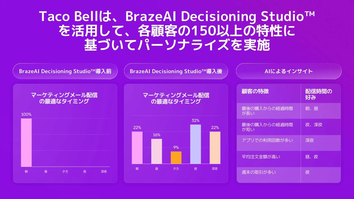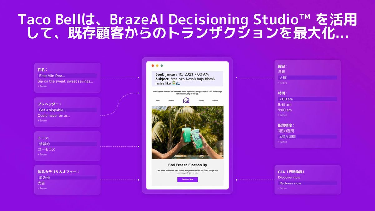 例えば「Taco Bell」は、「BrazeAI Decisioning Studio」を活用し、アクティブ顧客の取引数最大化に取り組んでいます。件名からヘッダー、配信時間帯、チャネル、オファー種類まで、あらゆる要素をテストしています。
