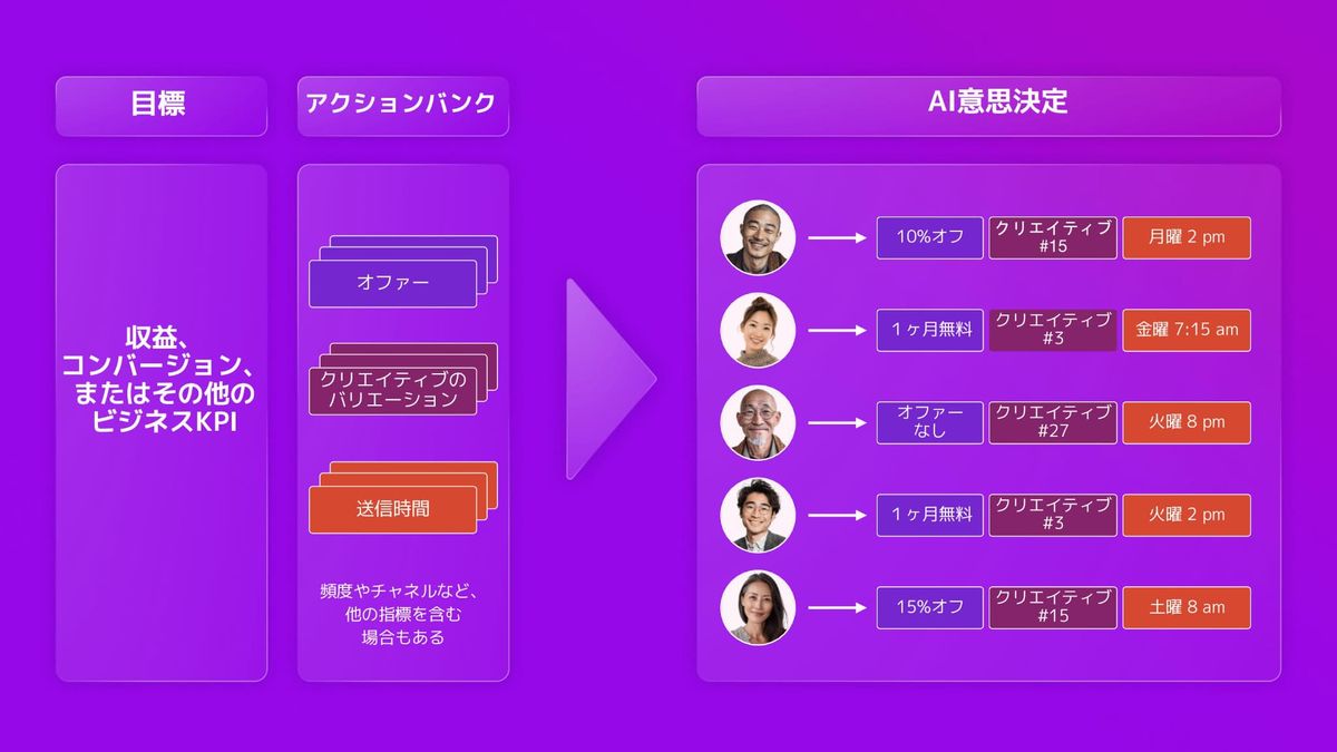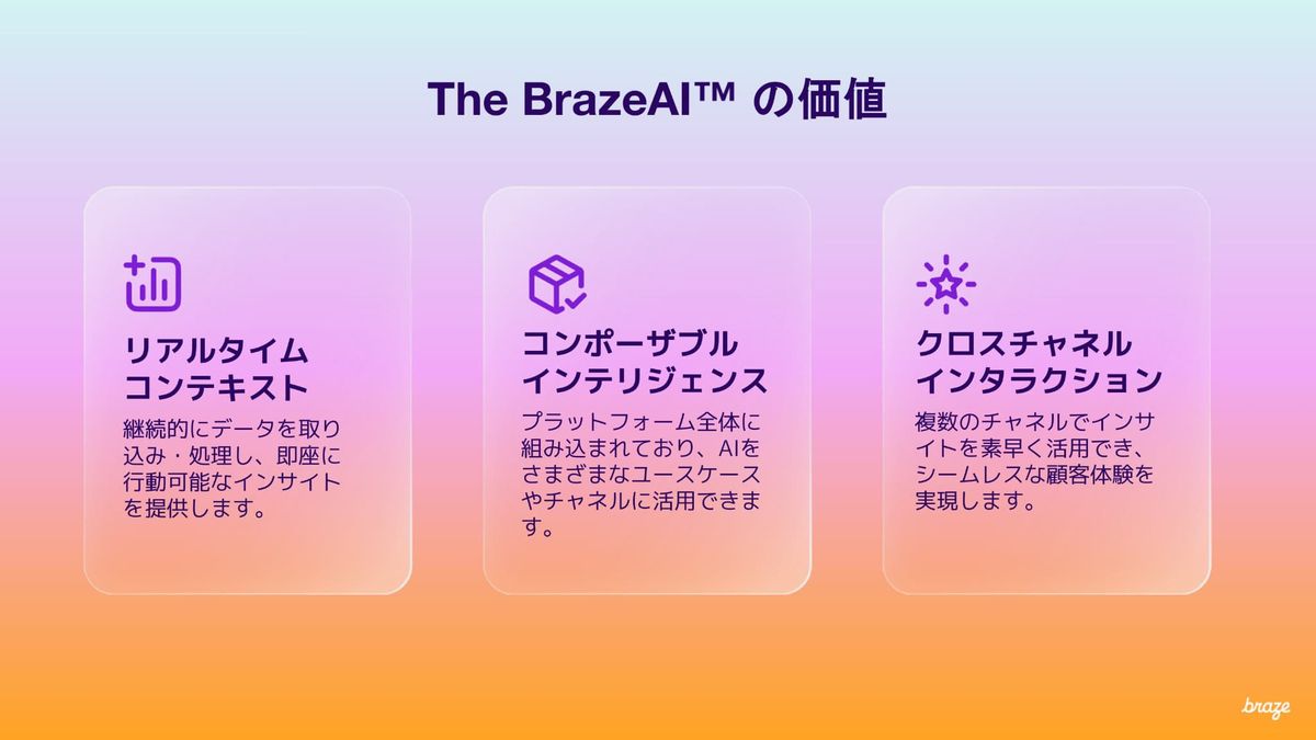 つまり、BrazeAI Decisioningは一人ひとりに対して、一対一の最適な判断を行うのです。すでに多くの顧客企業がこの力と柔軟性を活用しています。日本のブランドにも、ぜひこのメリットを享受していただきたいと思います。