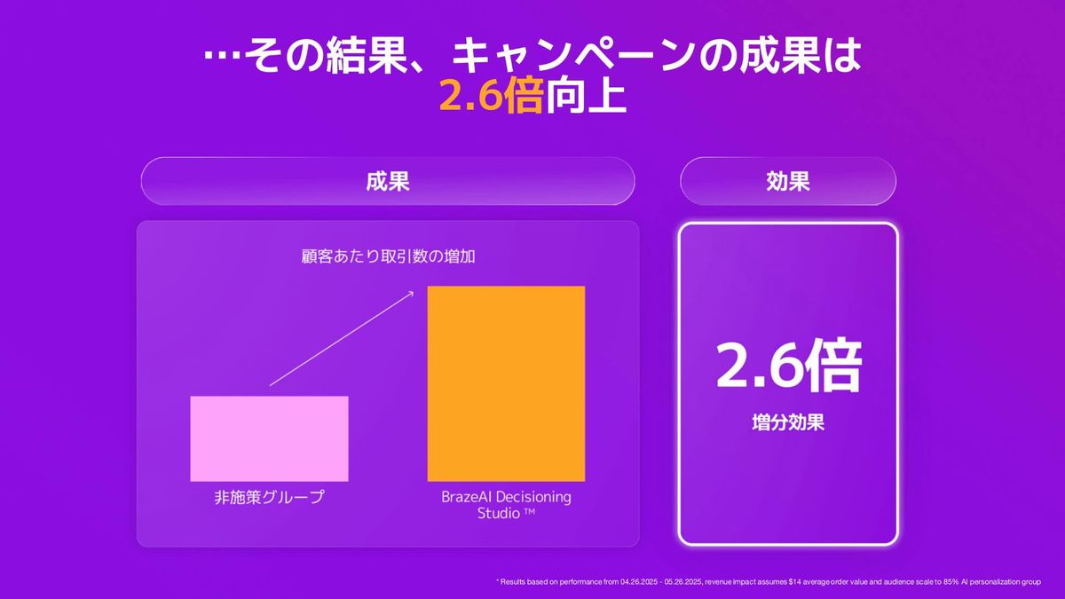 結果はすばらしいものです。Taco Bellでは従来戦略と比べて、顧客1人あたりの取引数が2.6倍に向上しました。日本企業にも、このAI Decisioning Studioで成果向上をもたらせることを楽しみにしています。