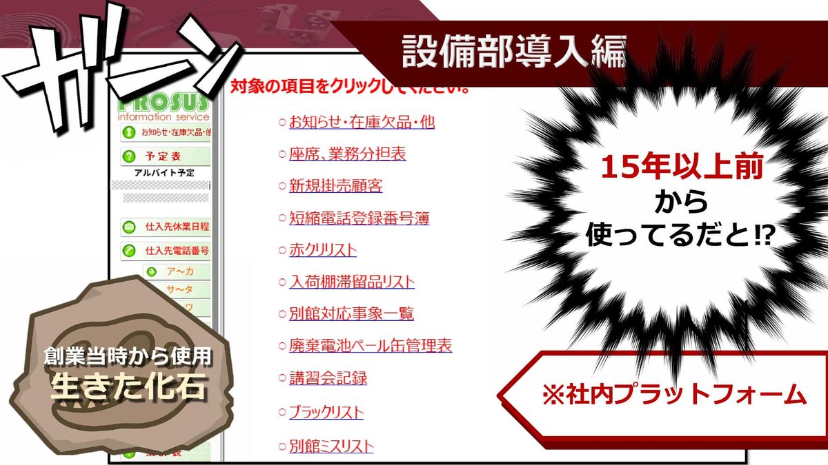 小田:「平成初期のホームページかな?」と思わせるような古臭いプラットフォーム、こんなものも廃止です。kintoneのポータル画面にプロサスのプラットフォームを全部落とし込むことに成功しました。しかもスマホからも綺麗に見ることができますよ。