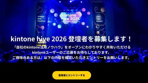 あなたもkintoneの活用事例を大きな舞台で発表してみませんか? kintone hiveではご登壇いただけるkintoneユーザーの方を募集しています。