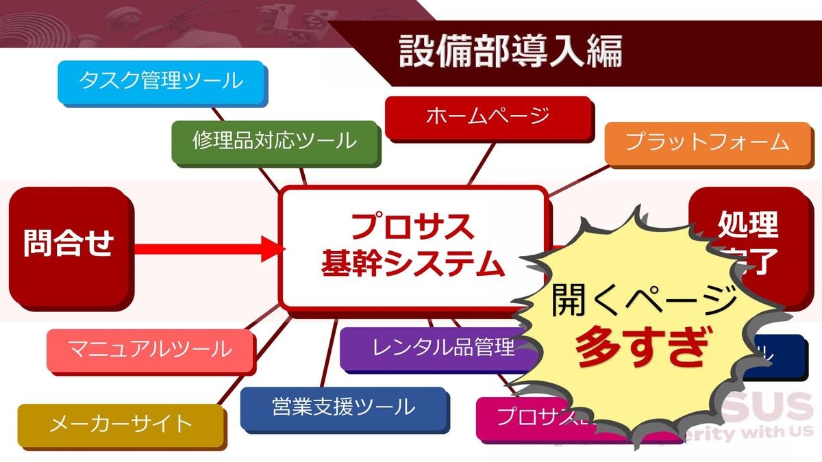 さらにプロセスの基幹システムを軸に、問い合わせから処理完了まで、これだけページを開いていることがわかりました。開くページがちょっと多すぎます。