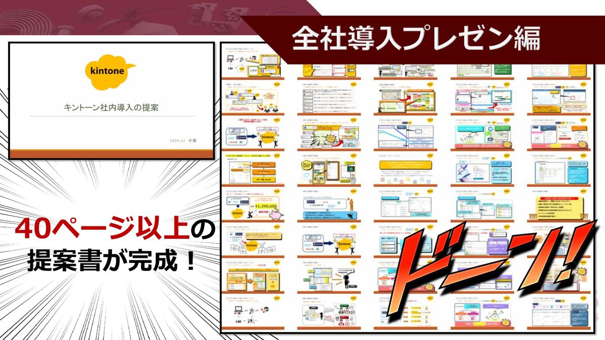 これはもうkintoneでどうにかするしかありません。「目指せ全社導入」ということで、私、小田は提案書を作ります。kintoneのおかげで設備部はなんて便利になったんだろうなと思いながら、作った提案書がこちら。なんと熱意がこもりすぎて40ページ以上の提案書が完成しました。