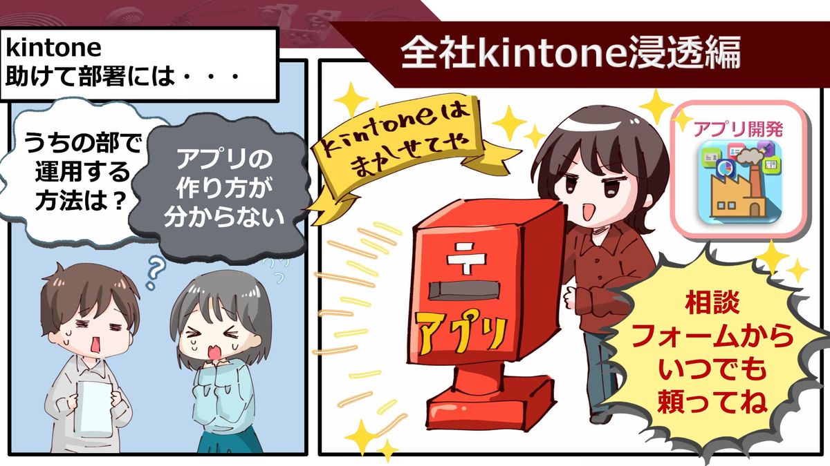うまくいく部署ばかりではないんですよね、やっぱり。「うちの部署での運用方法がわからない」とか「アプリの作り方がわかりません」、そういった方に向けて「kintoneのことなら小田にいつでも頼ってください」という環境を作りましたところ、無事kintoneの浸透化が完了しました。