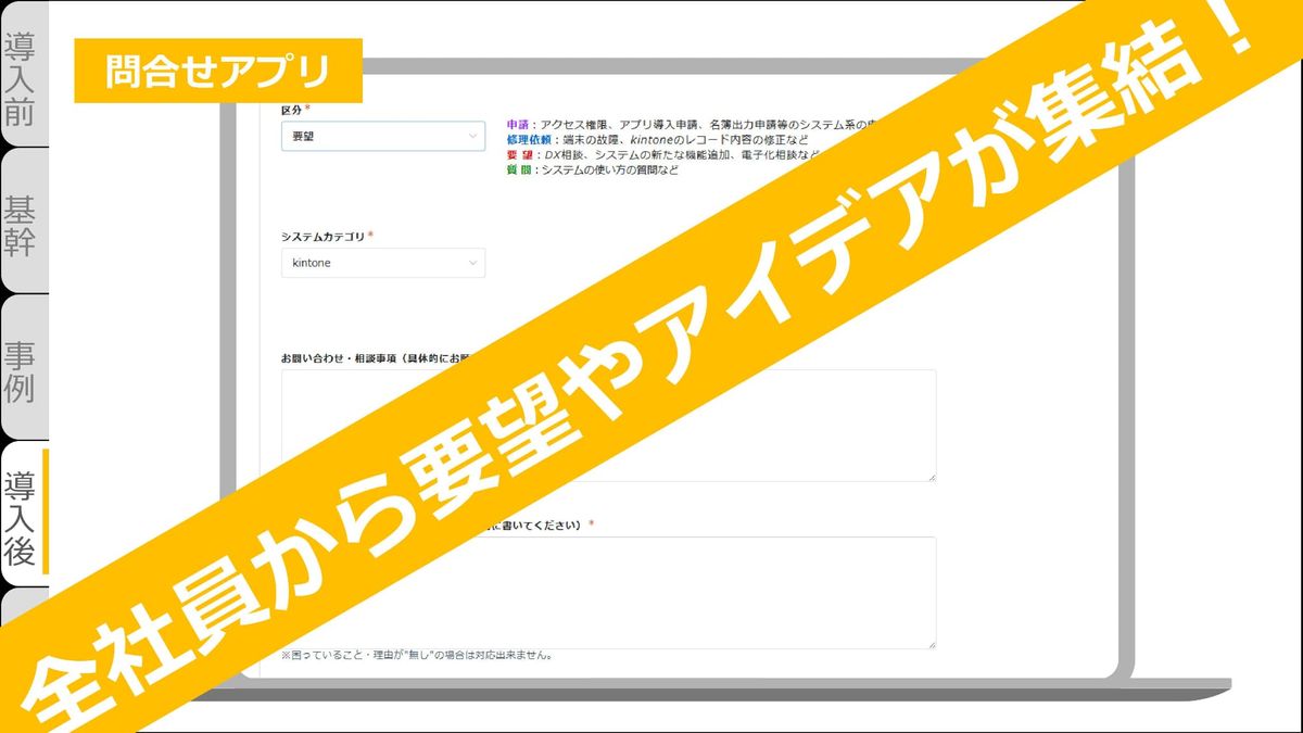 導入後の会社の状態です。さまざまな部署で成功体験が積まれたことによって、全社員のDX意欲が向上しました。そこで私たちは「問合せアプリ」を作成しました。ここでは全社員から要望やアイデアが集まっています。