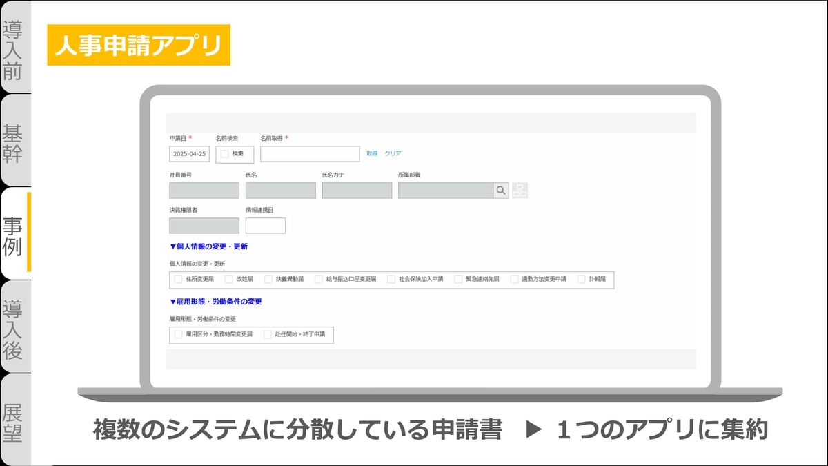 江﨑:人事・総務関連の申請DXです。これまではExcelや紙、システムなどから申請をしておりました。そのため、「人事申請アプリ」を作成しました。複数のシステムに分散している申請書を1つのアプリに集約しています。