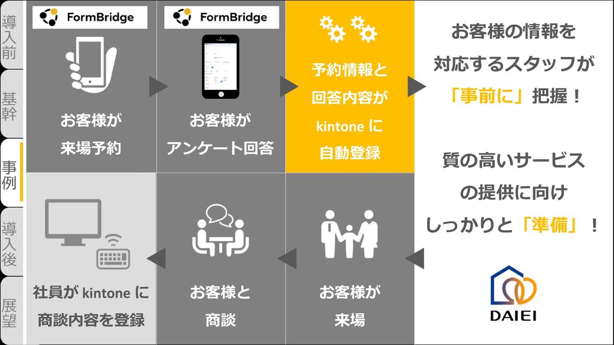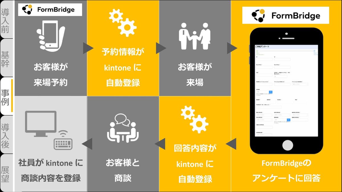 柚田:もともとの業務の流れが、このように変わりました。お客さまがFormBridgeで来場予約をすると、その情報はkintoneに自動で登録されます。そしてお客さまが来場した後のアンケートもFormBridgeなので、その内容がkintoneに自動登録されます。