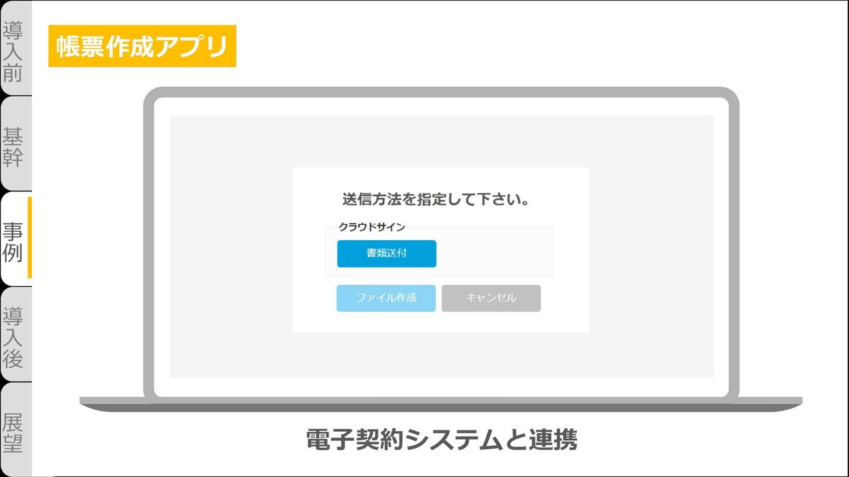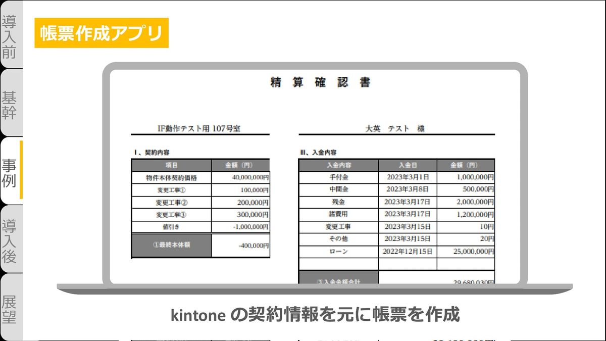 江﨑:契約書の作成DXです。これまではExcelを作成し、それらを印刷、収入印紙も貼っていました。それが、「帳票作成アプリ」によってkintoneの契約情報を元に帳票が作成できるようになりました。