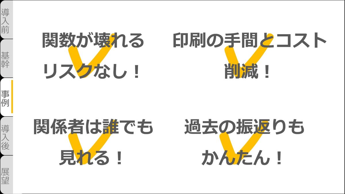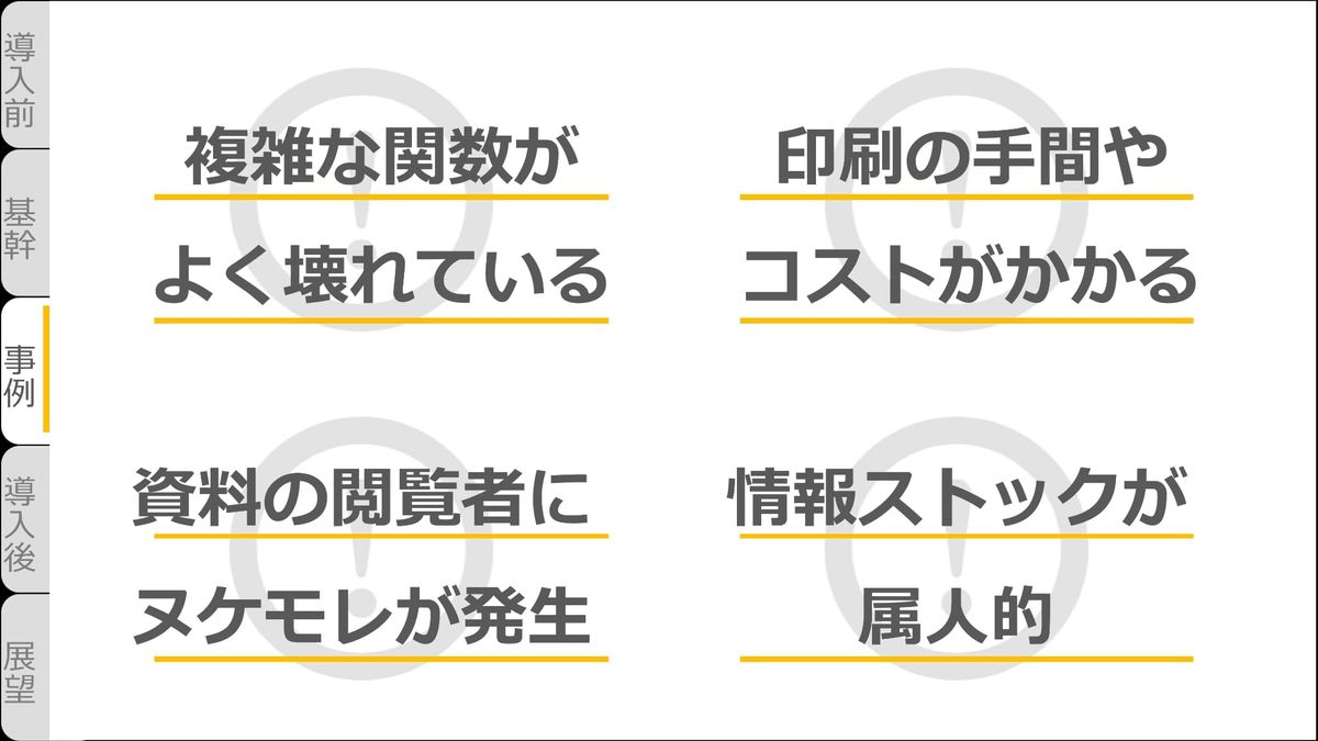そのため、複雑な関数がよく壊れていたり、印刷の手間やコストがかかったり、資料の閲覧者に抜け漏れが発生していたり、情報ストックが属人的。このような課題がありました。