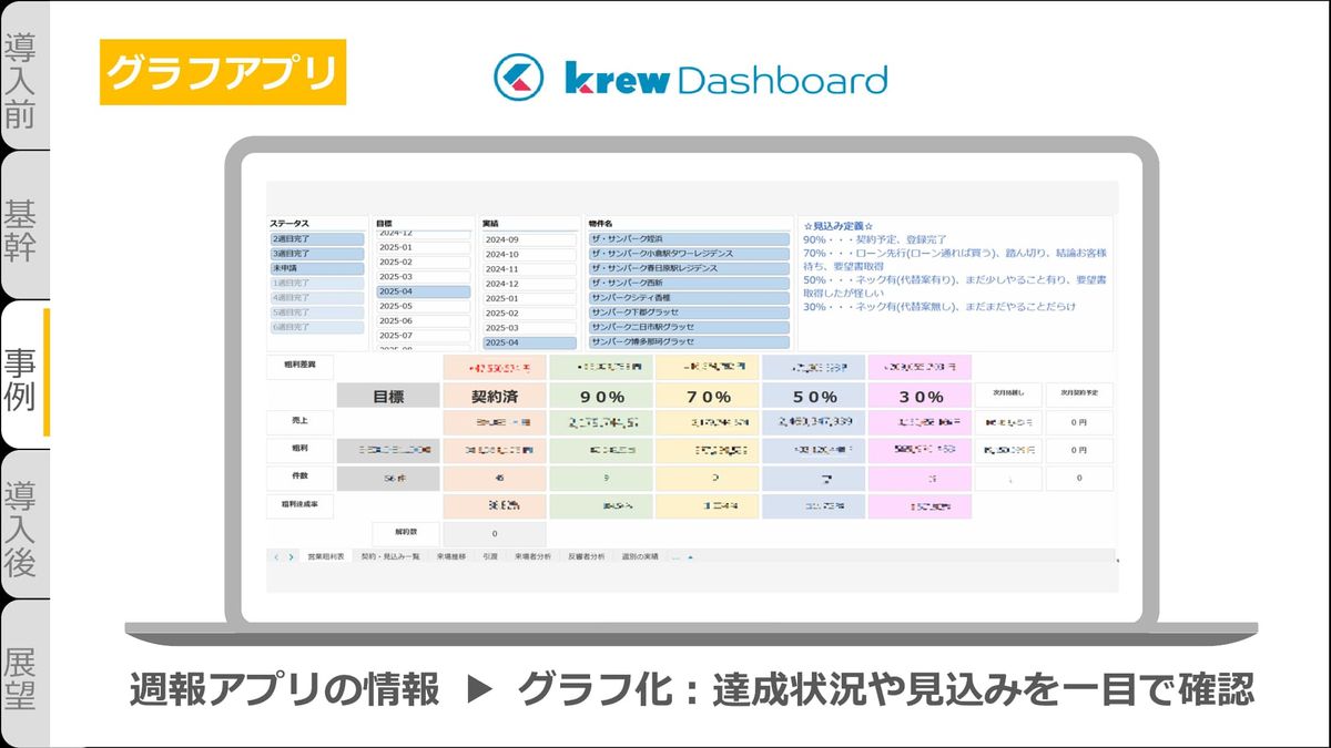 また、このデータを使って「グラフアプリ」というものを作成しました。ここでは週報アプリの情報を元にグラフ化することで、達成状況や見込み状況を一目で確認できるようになります。