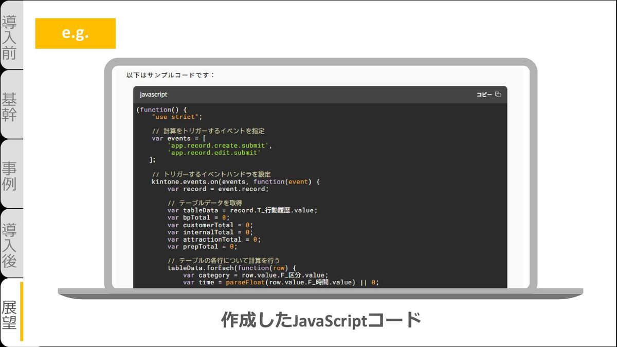 ここにはポイントがございます。「cybozu developer network」公式ドキュメントに準拠。「kintone JavaScript API」を適切に使用。このポイントを守ることによって文系でもできます。現在は設定を行っていますが、集計や予測も視野に入れています。