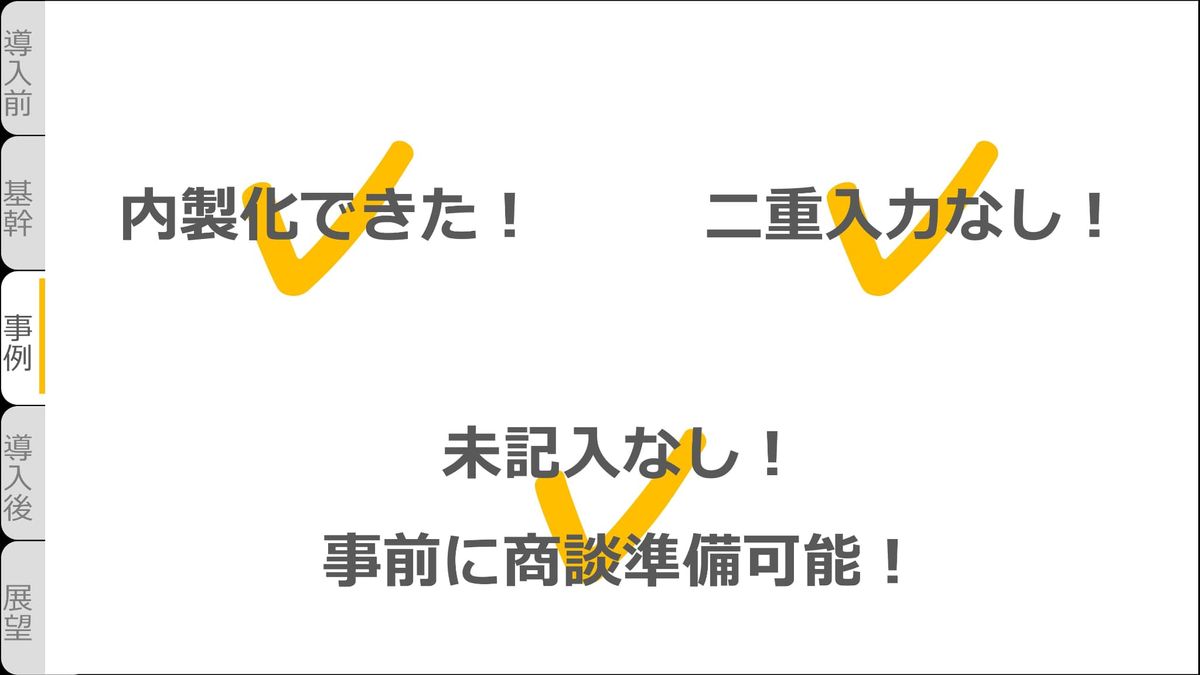 最初は基幹システムとして移行したkintoneでしたが、それに付随する業務もkintone化ができました。