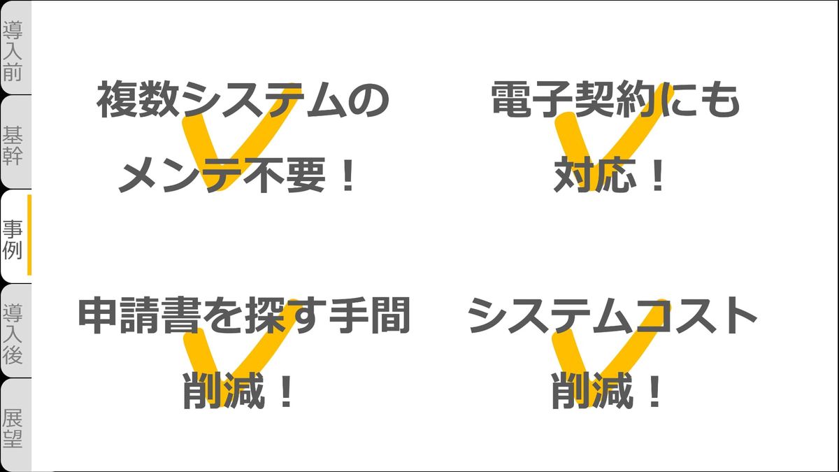 その結果、複数のシステムメンテナンスが不要に。アナログ業務も……電子契約にも対応。入り口がバラバラだったのも……探す手間を削減。(システム)コストを削減できました。これらもライブ改善で行ったことです。