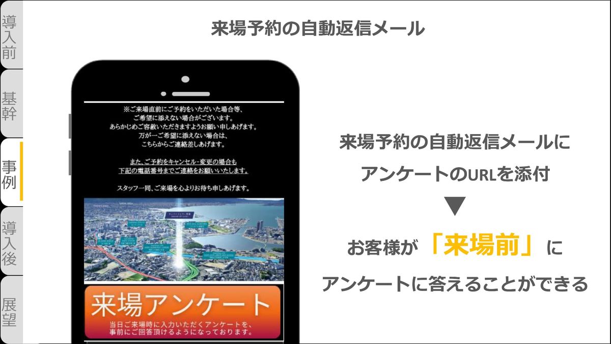 さらに、紙の時には難しかった必須の入力機能を付けることによって、集まる情報の質が格段に向上しました。さらにさらに、来場予約の自動返信メールにアンケートのURLを添付しています。これによってお客さまが来場前にアンケートに答えることができるようになりました。