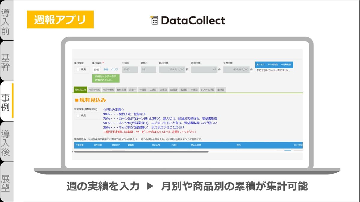 そこで私たちは「週報アプリ」というものを作成しました。ここでは週の実績を入力すると、そこから月別や商品別の累積が集計可能になります。