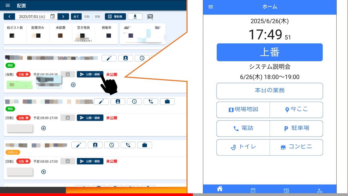 もともとホワイトボードで管理していたこちらの作業を、KOMAINUを使うことで電子でありながらホワイトボードのようにグイッと直感的に隊員さんを配置することができます。そして公開ボタンを押すことで、隊員さん用の超シンプルなモバイルアプリに情報が共有されます。