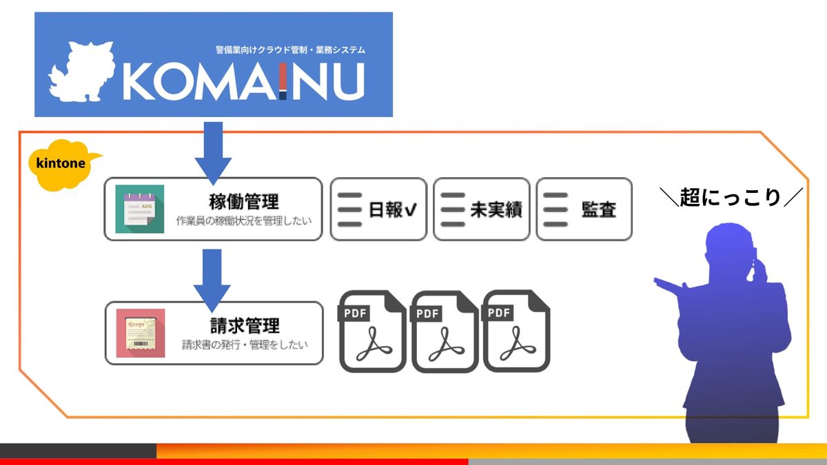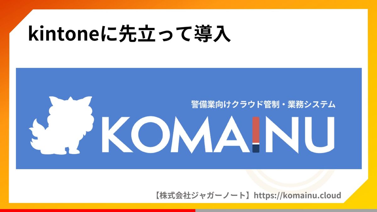 中西:「だったら使わなきゃいいじゃない」ということで、kintoneに先だって導入したのが、こちら、警備業クラウド管制・業務システム「KOMAINU」です。