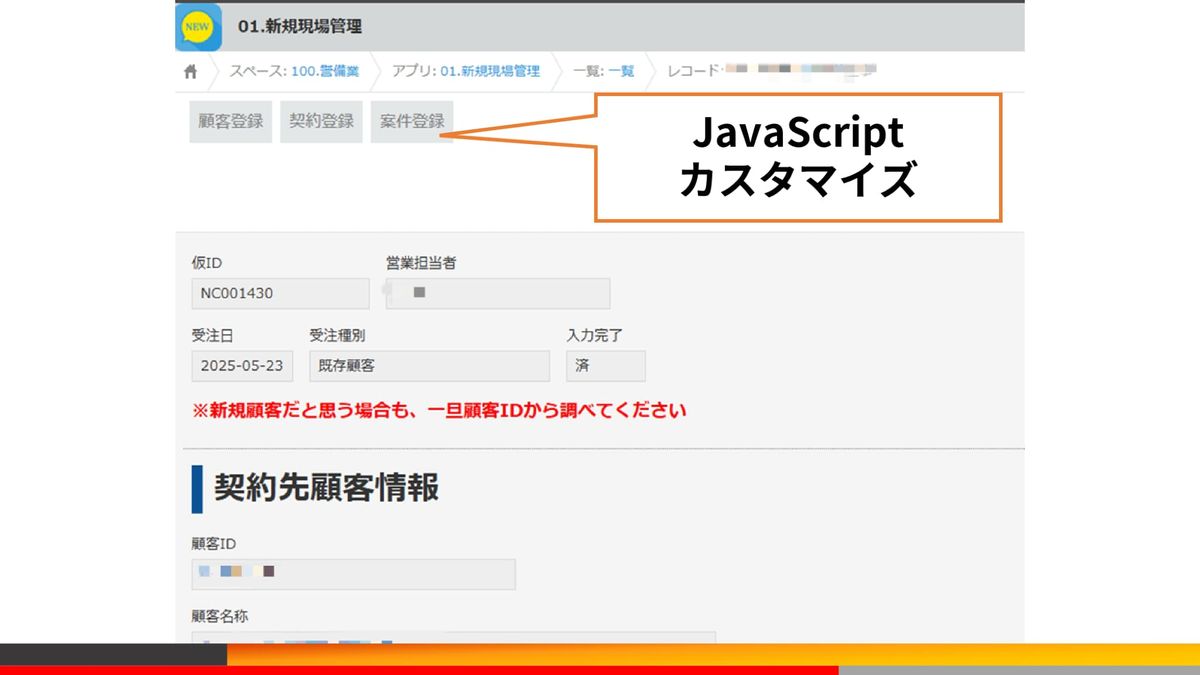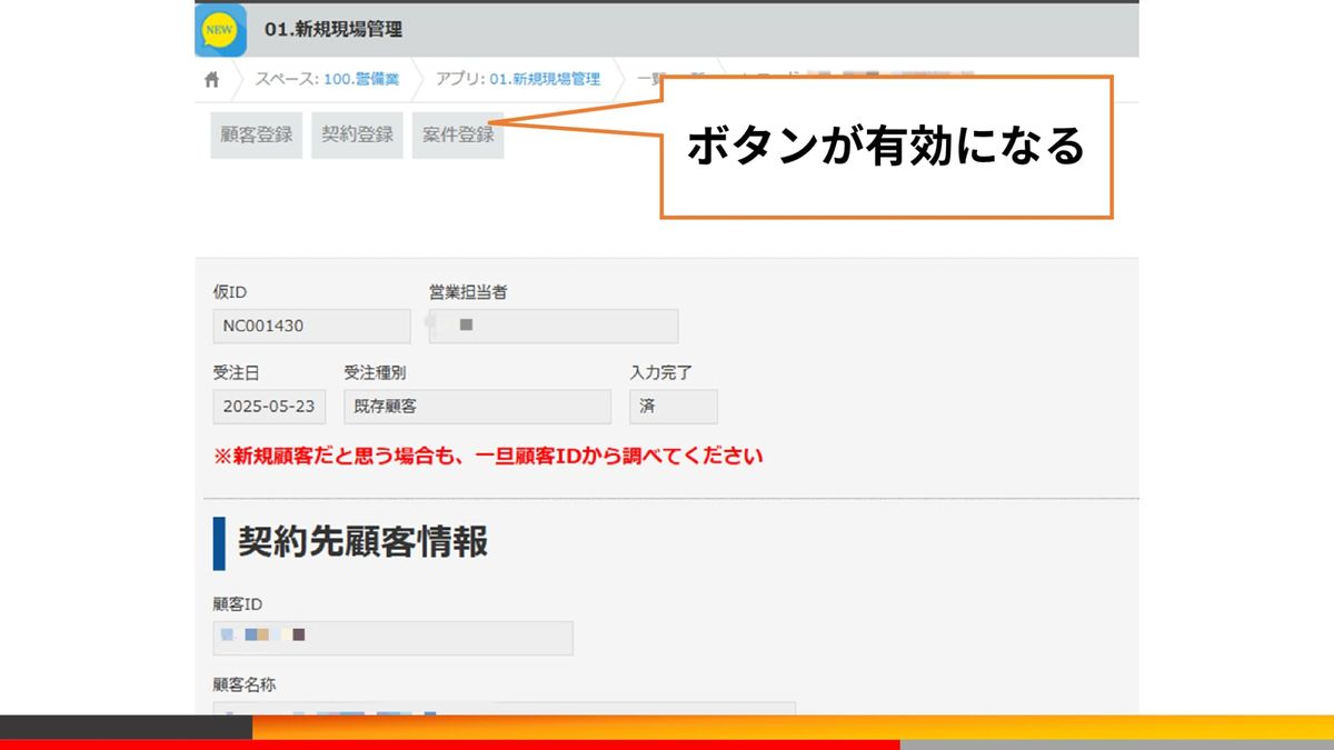 こちらはレコードに情報を登録することで、条件に応じて上のボタンが有効化されます。例えば新規顧客を選択した際は、顧客登録ボタンが有効になるといった感じですね。