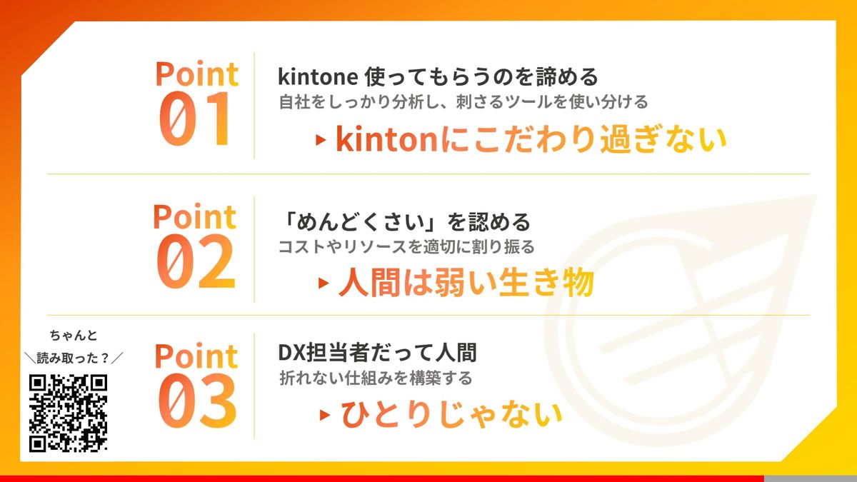 無理にkintoneにこだわり過ぎないこと。人間は弱い生き物だから、仕組みで対応しましょう。そして3つ目、1人で抱え込まずコミュニティに行ってみてください。いいところ、1人じゃないよっていうことを全力でプレゼンします。