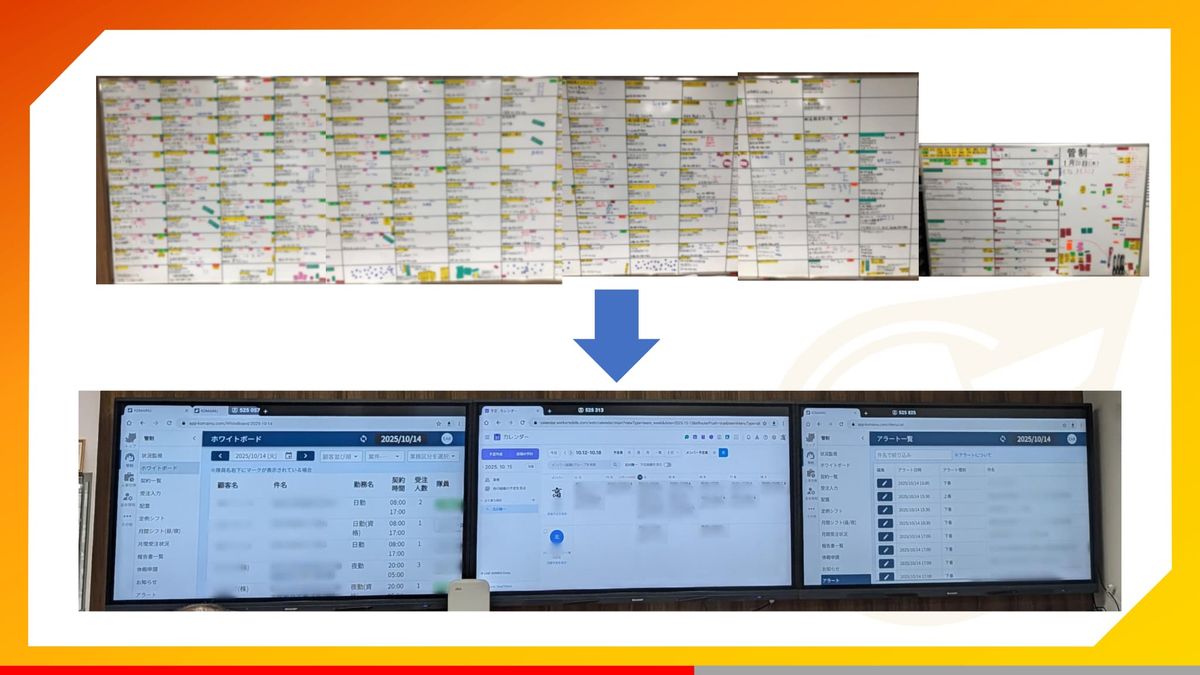こんな改善をすることで、この5メートル級のドン引きホワイトボードが、今はドデカモニター3枚になっております。
