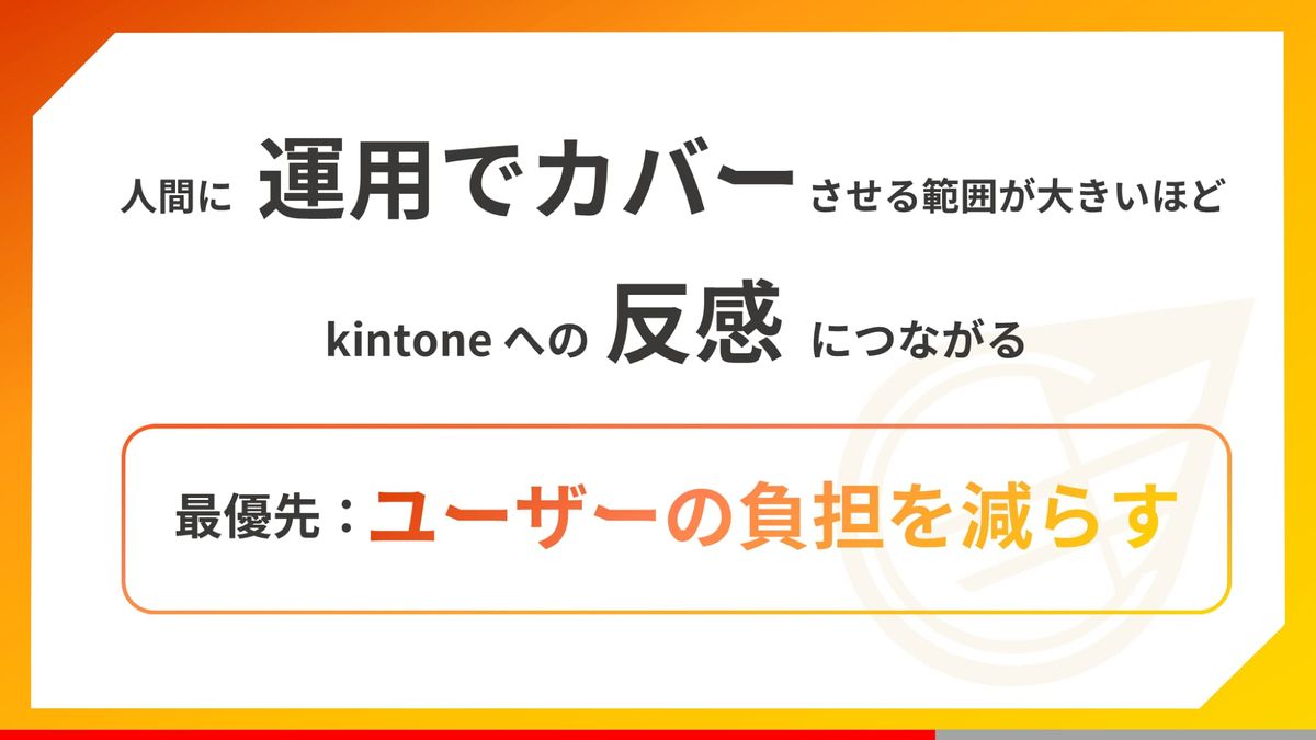 システム側に人間が寄り添っていければ……もちろん理想ではあるんですが、どうしても人間に運用でカバーさせる範囲が大きいほど、kintoneへの反感につながってしまいます。特に導入段階において、kintoneの印象を下げないためにも、私たちは「ユーザーの負担を減らすこと」を最優先にしようと意思決定を行いました。