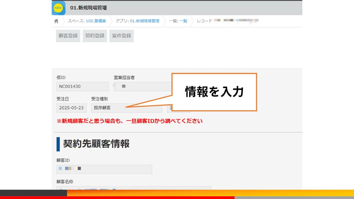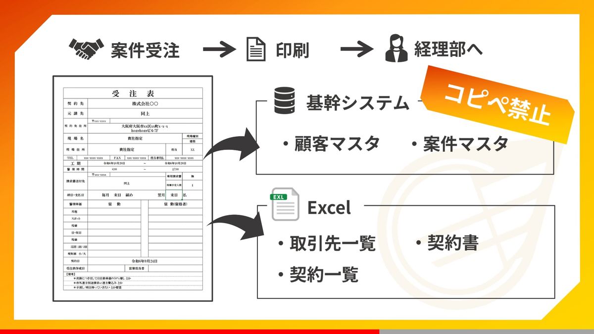 例えば、営業さんが案件を獲得した際に、弊社では、顧客登録・契約登録・案件登録という処理が必要になります。もともと5回転記することで運用していたんですが、これがkintoneになったからといって、各種マスタに登録しないといけないのは変わりませんよね。