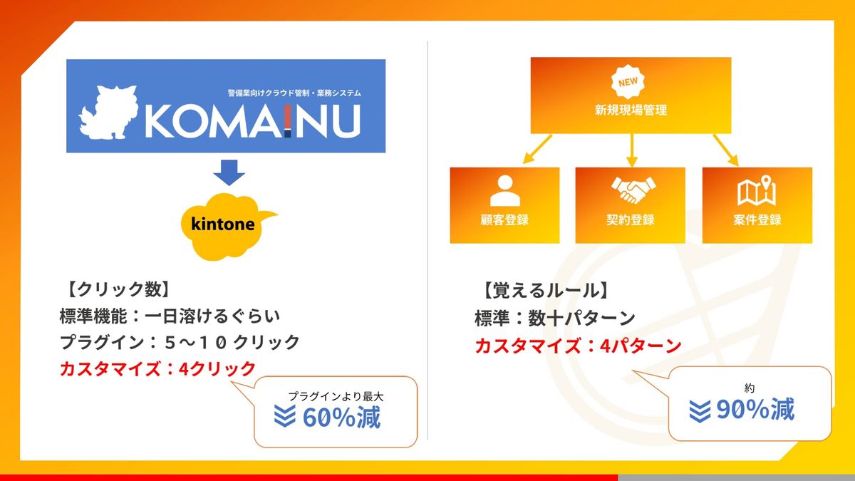 というわけで、スマホが苦手な隊員さんにはインターフェースに特化したKOMAINU。処理が煩雑な事務員さんにはカスタマイズ性に優れたkintone。