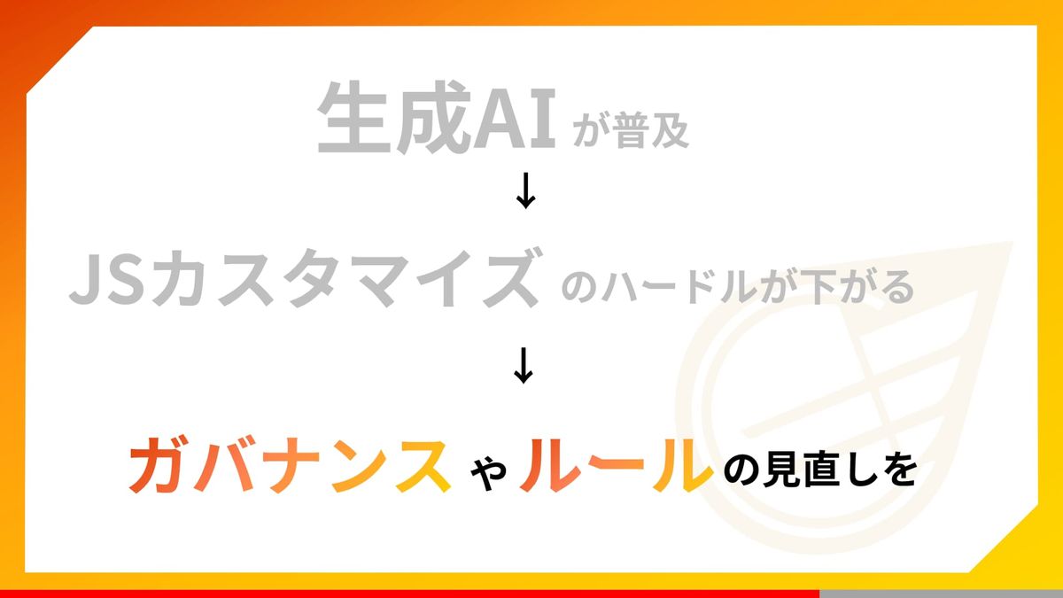 最近は生成AIが普及してきて、カスタマイズのハードルがグッと下がったと思います。私たちも実際に生成AIを活用しているんですが、さっきのリスクが全部なくなったわけじゃないんですよ。だからこそ、ガバナンスやルールをあらためて見直す必要があるかなと私は考えております。