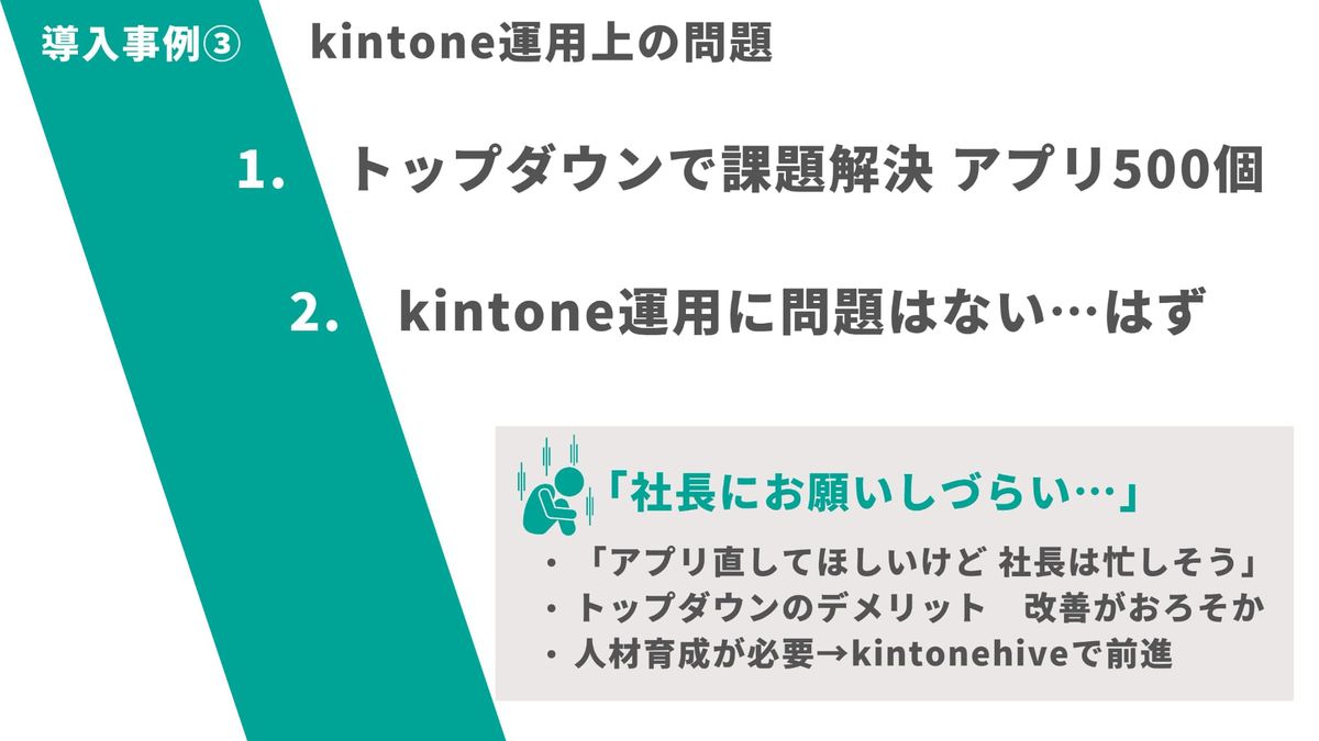 大野:導入事例、3つ目。kintone運用上の問題です。私はこれまでトップダウンで現場の課題を解決し、500個以上のアプリを作ってきました。kintone運用に問題はないはずでしたが、社員たちの気持ちはぜんぜん違いました。