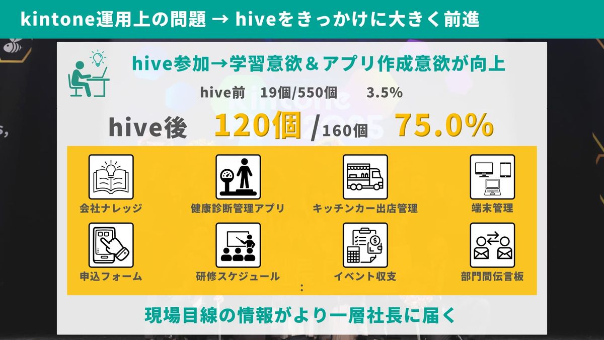 hiveをきっかけに、社員たちは前に進んでくれました。hive前、3年弱で作ったアプリ550個のうち、社員が作ったアプリは19個。hive後、4ヶ月で120個のアプリを社員たちが作ってくれました。