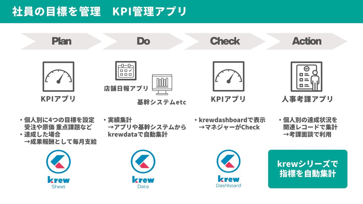 実績は、複数のアプリからkrewDataで自動集計し、「krewDashboard」でマネージャーがチェックします。そして、個人別の達成状況を人事考課アプリに関連レコードで集計し、社員との考課面談で利用することで、社員みんなの次の「Action」へつなげていきます。