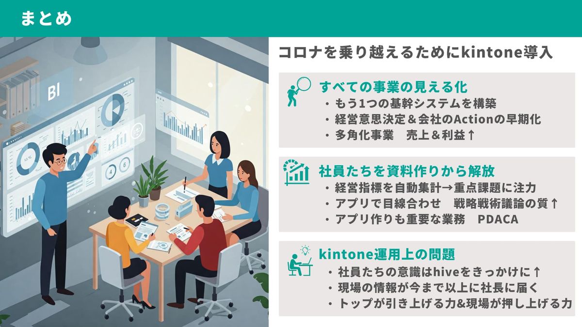 大野:まとめです。コロナを乗り越えるためにkintoneを導入しました。まず、すべての事業を見える化するためにもう1つの基幹システムを作りました。