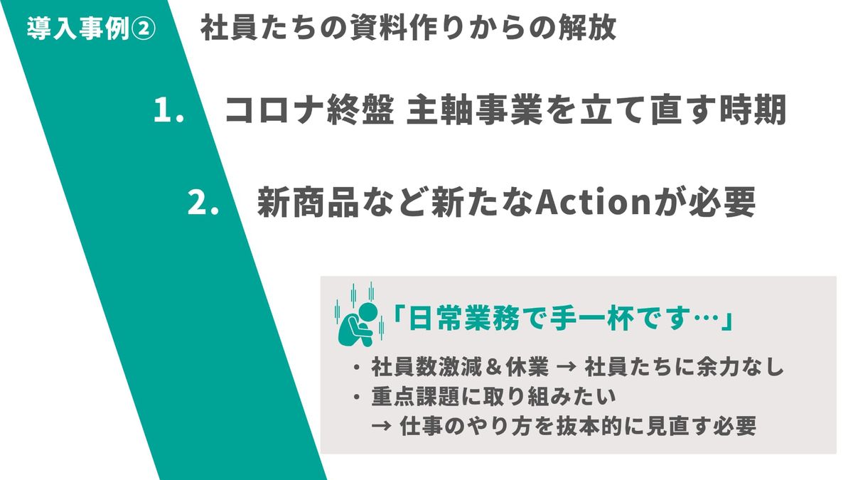 大野:続いて、導入事例2つ目。社員たちの資料作りからの解放です。コロナも終盤になり、主軸のブライダルなどを立て直す時期が来ました。そのためには新商品など新たなアクションが必要でした。