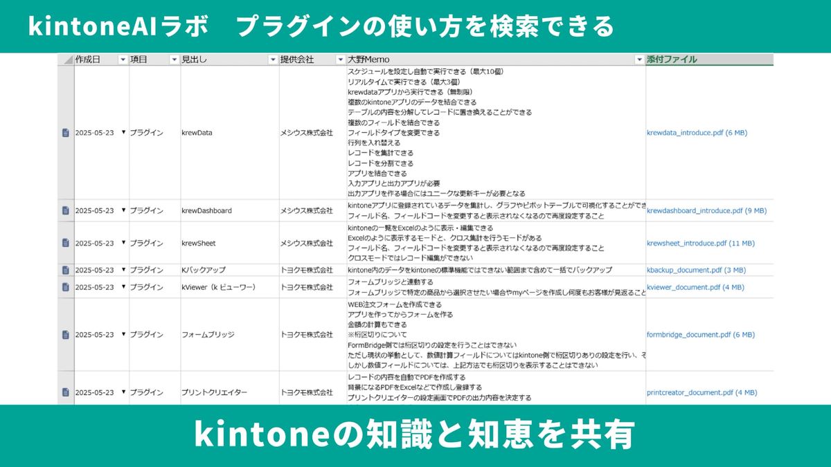 また、「kintone AIラボ」を利用し、プラグインの使い方を検索できるようにしました。画面のようにナレッジアプリを作り、私のメモを記載し、提供会社の公式資料も添付しています。このように、私が持っているkintoneの知識と知恵をみんなに共有しました。