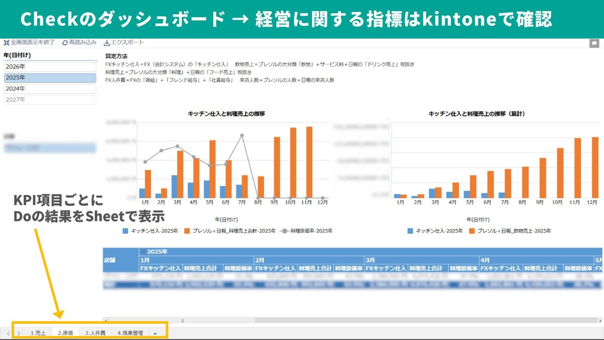 「Check」のダッシュボード画面がこちらです。KPI項目ごとに「Do」の結果を「krew Sheet」で表示しています。このように経営に関する指標はkintoneでいつでも確認できるようになりました。