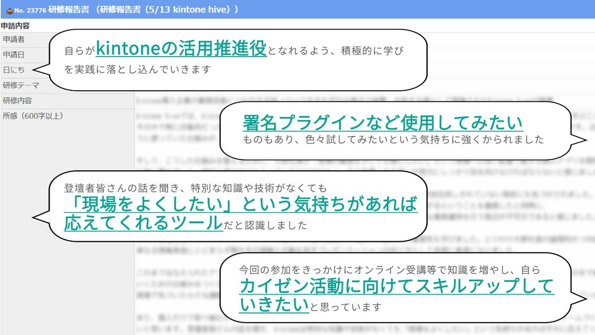 こちらが、社員たちが自発的に提出してくれたhive sendaiの報告書です。「kintoneの推進役になりたい」「他社事例にあったプラグインを使ってみたい」など、kintoneに対する主体性が生まれました。とてもうれしかったです。私はみんなの学びを後押ししました。