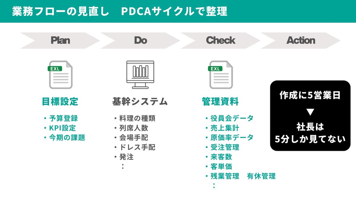 当社の業務フローを見直す際、横軸にPDCAサイクルを使って整理しました。既存の基幹システムは結婚式などのイベント管理が目的なので、登録する情報は料理の種類、列席の人数など「Do」に関する情報ばかりです。