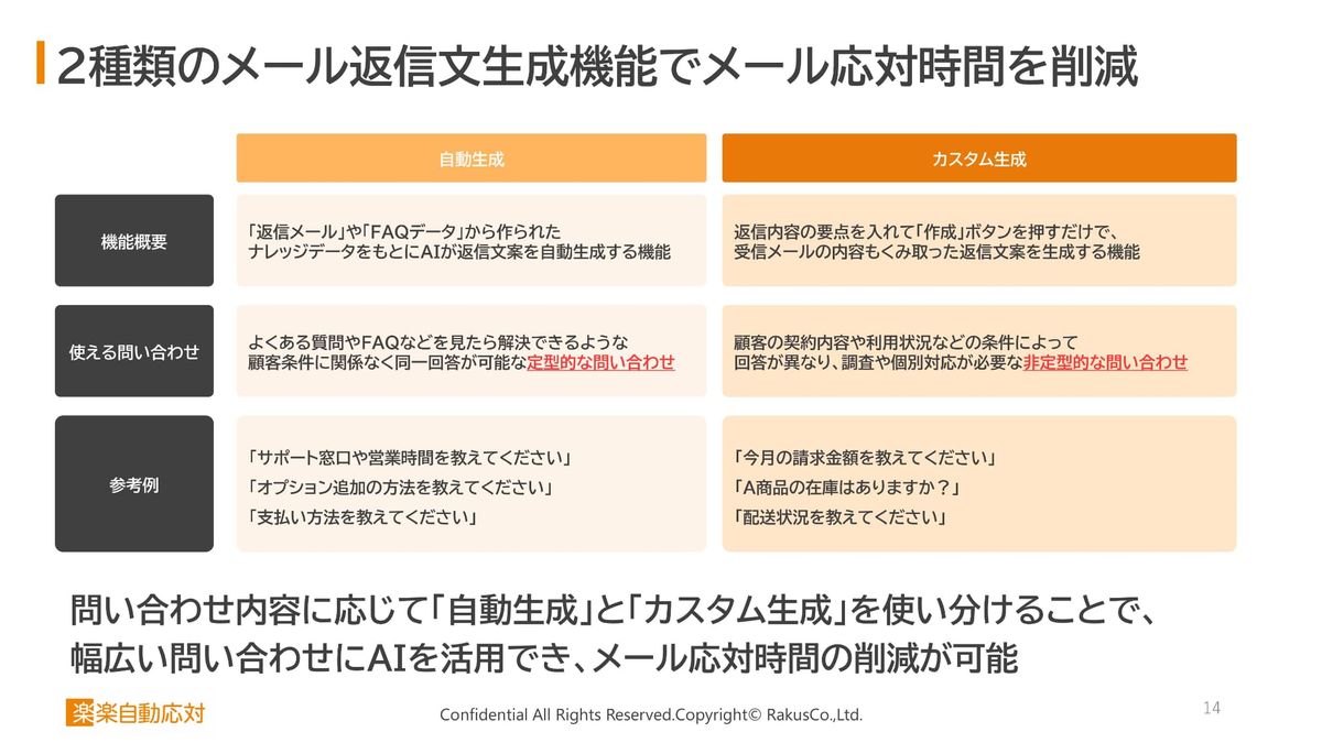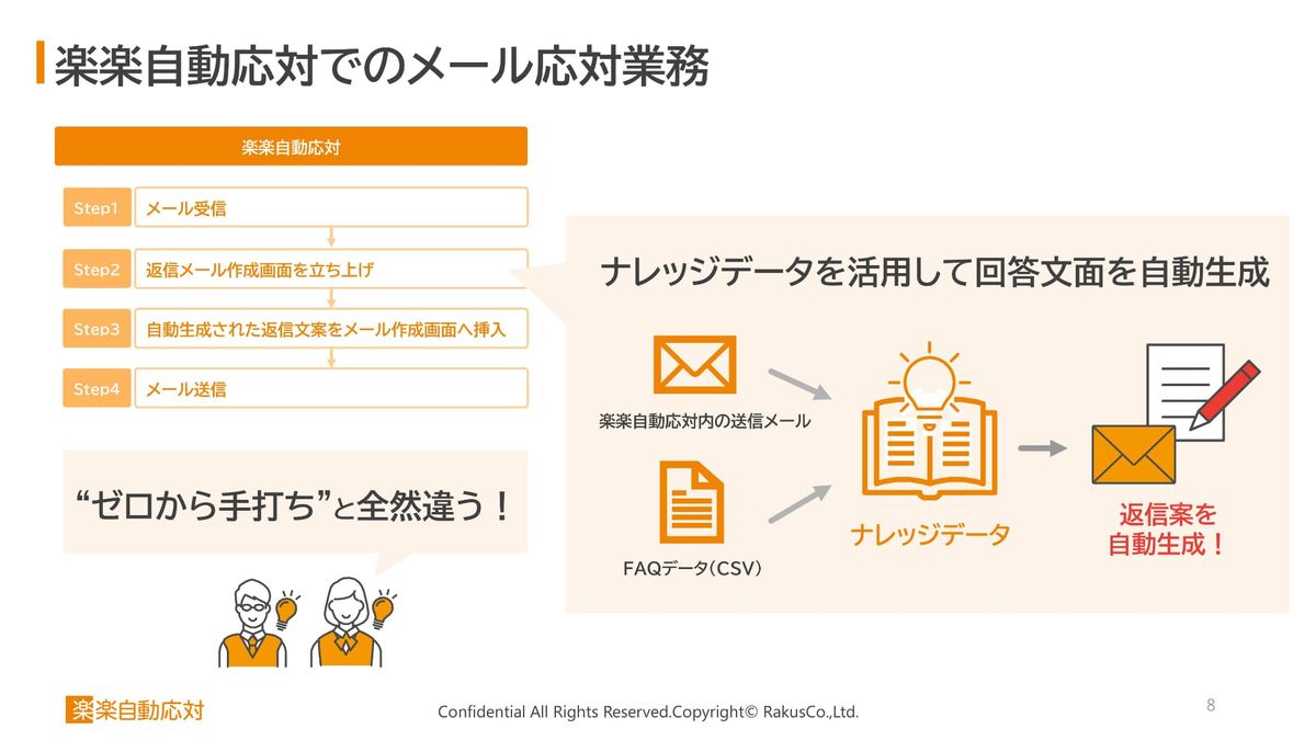 我々も、当社カスタマーサポート部門で何も用意せずにやってみたのですが、こういう結果も出ています。社内の実際の事例にはなるのですが、こういったメールの文面作成をAIにやらせるだけでも、1通3分ぐらい削減ができています。