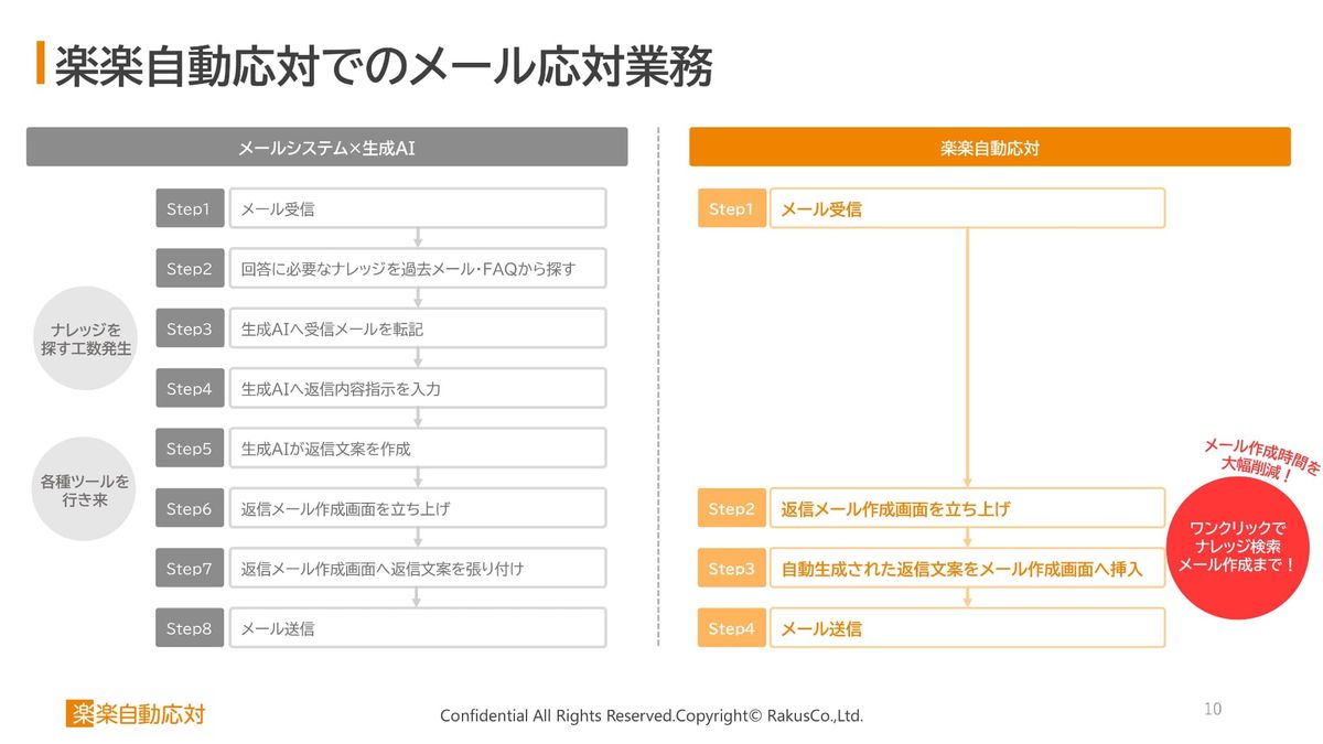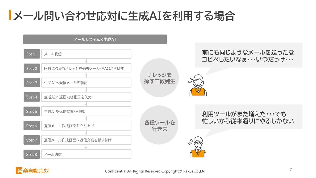 我々も「メールの問い合わせ応対に生成AIを活用していきましょう」というところを推進させていただいているのですが、その中で、普段だとナレッジを探す手間や、各種ツールを行き来したりすることがあると思います。