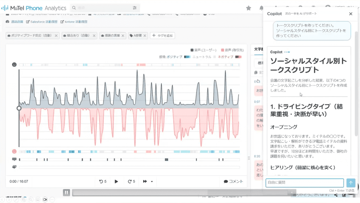 ここで、Copilotみたいな感じで出せるようになっていて、「トークスクリプトを作成してください」とか、それこそ「ソーシャルスタイル別に作って」というふうに自動で出せるようになります。