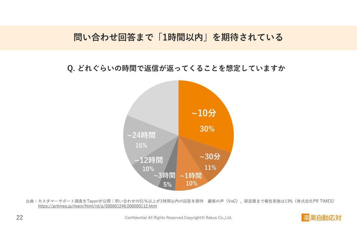 「問い合わせ後に、どれくらいの時間で返信が来ると想定しているか」という質問に対し、オレンジのところを見ていただくと、「1時間以内」と答えた方が51パーセントもいらっしゃいます。1時間かかるだけでも「遅い」と思われるかは五分五分になるのがわかります。