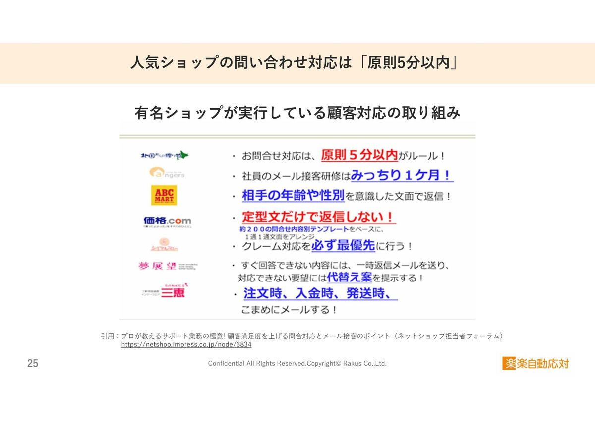 こちらは人気ショップや有名ショップの顧客対応の取り組みですが、ABCマートさんや価格.comさんが取り入れている顧客対応ルールには、「お問い合わせ対応は原則5分以内」というのがよく設定されています。