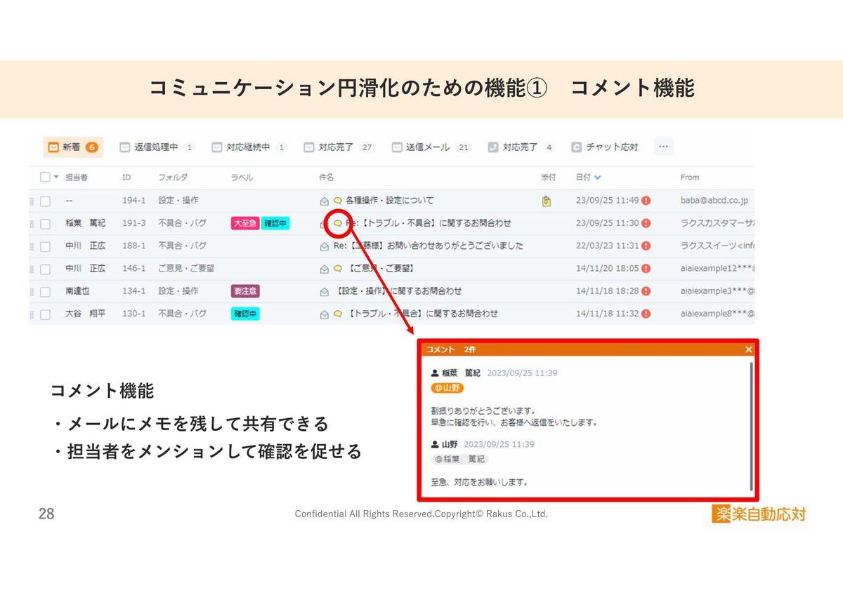 2つ目は「コミュニケーションを円滑化する機能」です。その中の機能の1つとして、「コメント機能」がありまして、メールにこのようにメモを入力できます。