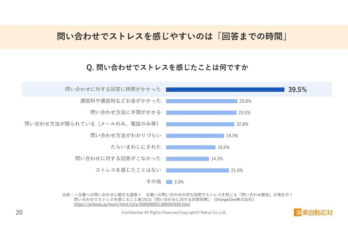 最初にご覧いただきたいのが、こちらのデータになります。企業への問い合わせで最も多くの方がストレスを感じているポイントに関する調査データです。企業に対する問い合わせにおいて、最も多くの方がストレスを感じているのは「問い合わせに対する回答に時間がかかった」という調査データになります。