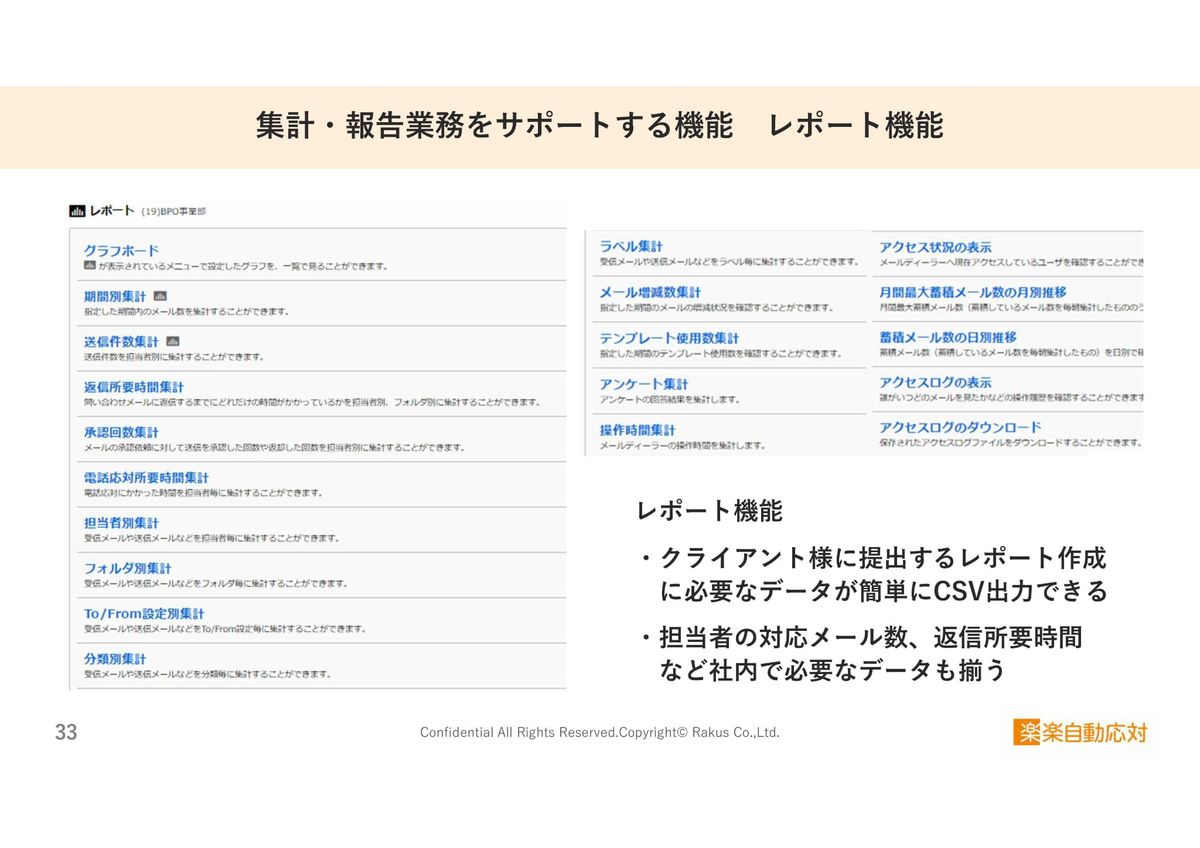 最後は「集計・報告業務をサポートする機能」です。豊富なレポート機能がございまして、メール共有管理機能内で持っているデータのうち、集計・分析によく利用いただくものを、あらかじめ取り出しやすいようにメニュー化しています。