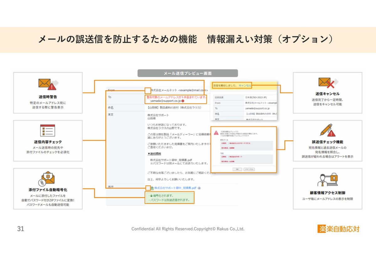 3つ目は「メールの誤送信を防止する機能」です。「情報漏洩対策オプション」というものがあり、過去に送ったメールと今回送るメールの宛名を比較して、違う宛名で送ろうとすると警告を出したり。あとは送信完了したあと、一定期間の間に送信をキャンセルできる機能になります。