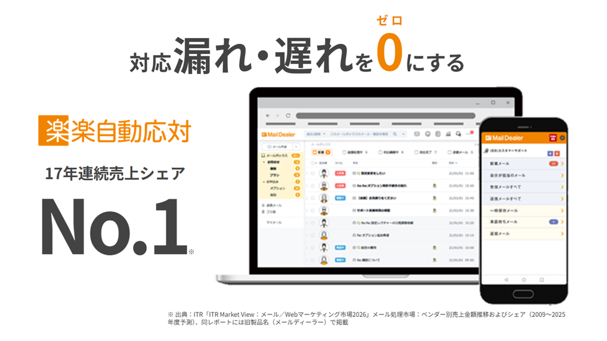 ※出典:ITR「ITR Market View:メール/Webマーケティング市場2026」メール処理市場:ベンダー別売上金額推移およびシェア(2009~2025年度予測)、同レポートには旧製品名(メールディーラー)で掲載